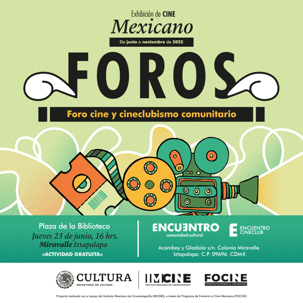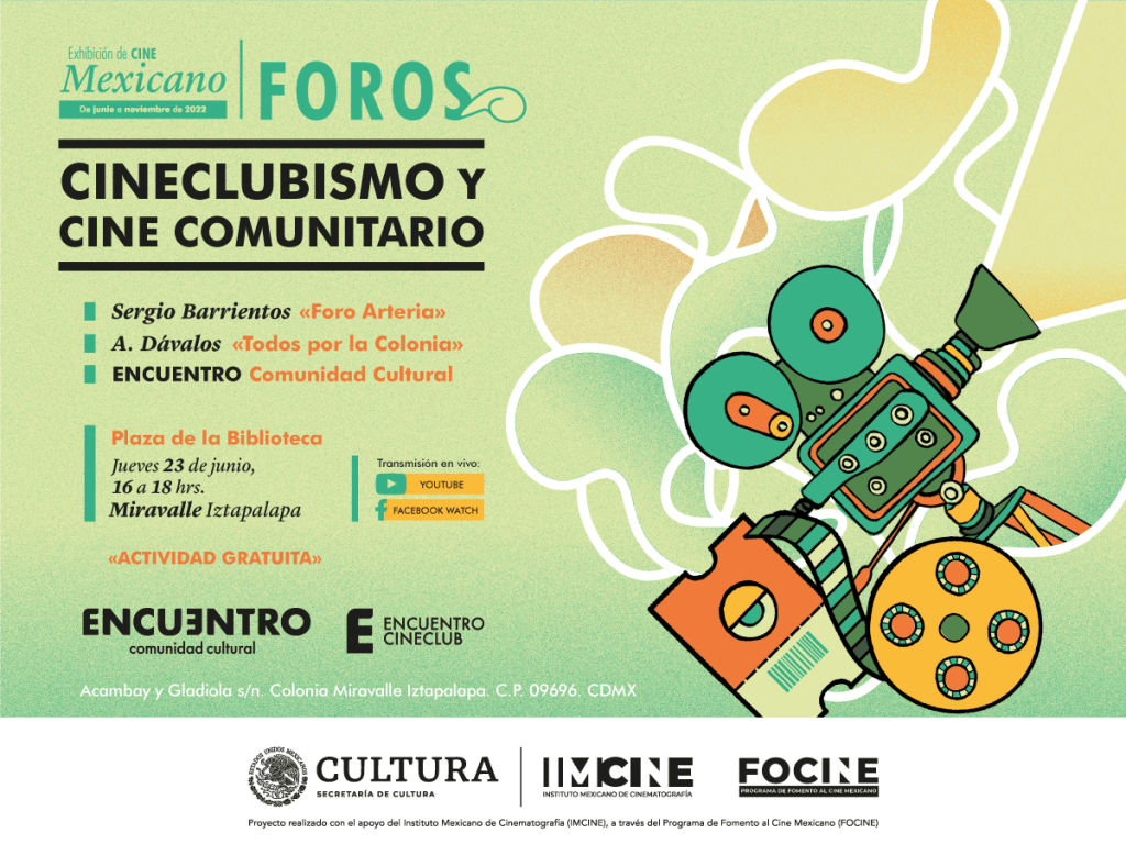 A través de una mesa de diálogo entre ENCUENTRO comunidad cultural, Foro Arteria, Todos por la colonia y Tú, podremos abordar temáticas relacionadas tanto al cineclubismo como al cine comunitario. Hablaremos sobre trayectorias y diversos proyectos; la importancia del cineclubismo y el cine comunitario en el entorno social; retos en común; visiones; y acceso a la cultura cinematográfica entre otras más.