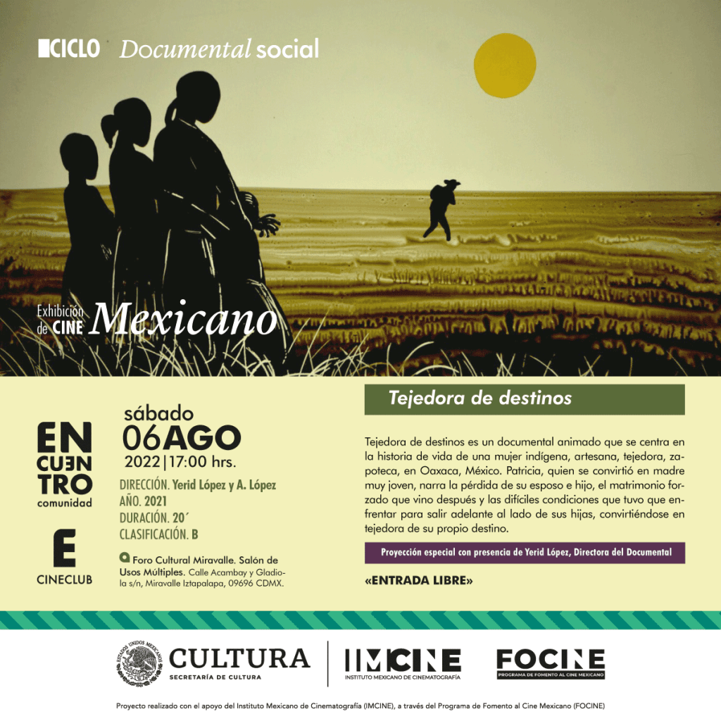 Como parte del proyecto de «Exhibición de Cine Mexicano» a través del programa de Fomento al Cine Mexicano FOCINE, de IMCINE. Te invitamos a nuestra primera Proyección Especial del documental «Tejedora de Destinos» acompañados de su realizadora Yerid López Barrera.