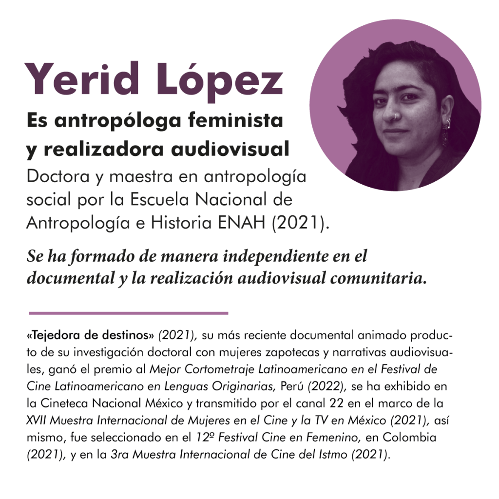 Yerid López Barrera es antropóloga feminista y realizadora audiovisual. Doctora y maestra en antropología social por la Escuela Nacional de Antropología e Historia ENAH (2021). Estudió la licenciatura en antropología social en la Universidad Autónoma Metropolitana-Iztapalapa (2012). Cursó el Diplomado Internacional: Los desafíos del feminismo en América Latina, CEIICH-UNAM (2012). Se ha formado de manera independiente en el documental y la realización audiovisual comunitaria.