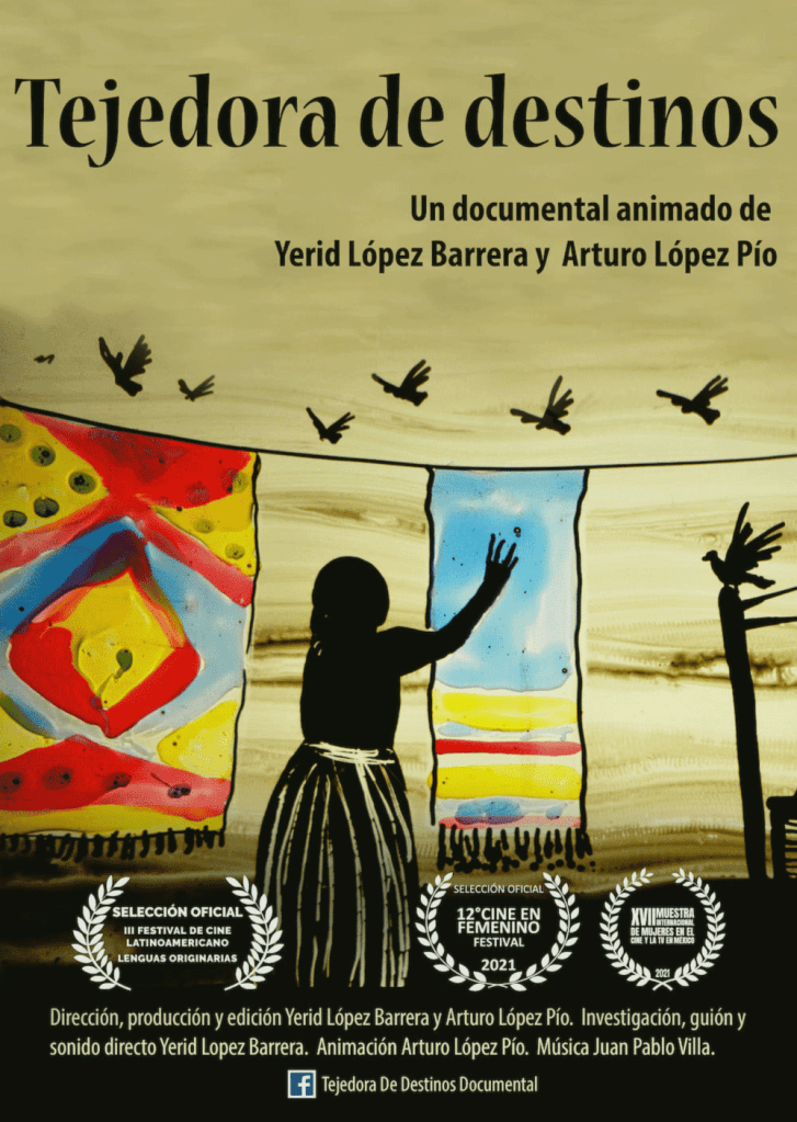 SINOPSIS: Tejedora de destinos es un documental animado que se centra en la historia de vida de una mujer indígena, artesana, tejedora, zapoteca, en Oaxaca, México. Patricia, quien se convirtió en madre muy joven, narra la pérdida de su esposo e hijo, el matrimonio forzado que vino después y las difíciles condiciones que tuvo que enfrentar para salir adelante al lado de sus hijas, convirtiéndose en tejedora de su propio destino.