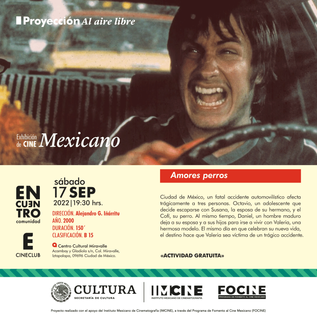 Como parte del circuito de «Exhibición de Cine Mexicano» a través del programa de Fomento al Cine Mexicano FOCINE, de IMCINE. Te invitamos a nuestra segunda Proyección Especial AL AIRE LIBRE y con pantalla gigante de la versión restaurada de la premiada película «Amores Perros» del director Alejandro González Iñárritu.