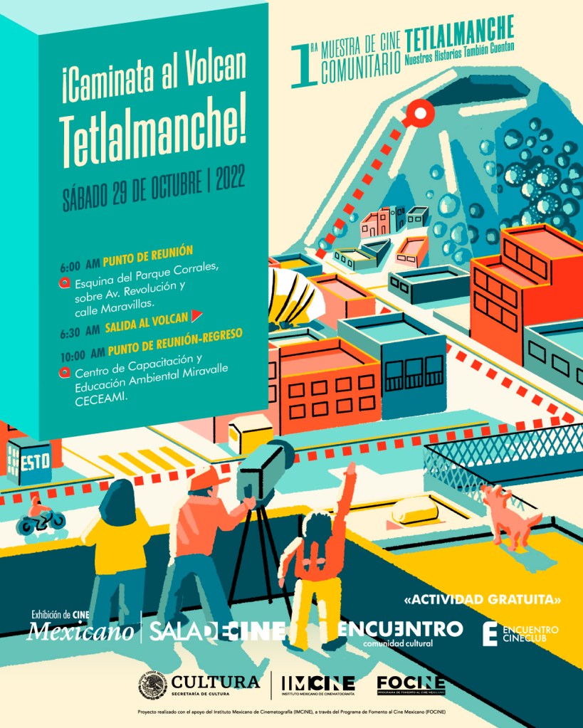 En el marco del circuito de «Exhibición de Cine Mexicano», a través del programa de Fomento al Cine Mexicano FOCINE de IMCINE. Te invitamos a nuestra 1ra. Muestra de Cine Comunitario TETLALMANCE Nuestras Historias También Cuentan. Con un programa compuesto por 12 cortometrajes, actividades con cápsulas de radio, charlas y una caminata al Volcán Tetlalmanche. Contando con la presencia de lxs realizadorxs.