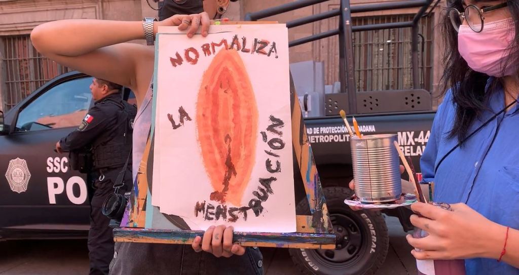 Sobre el tabú de menstruar, sangrar, manchar: tres pinturas recorren el Centro Histórico de la Ciudad de México, recaban las reacciones de la gente y las historias de las mujeres que las ven pasar.