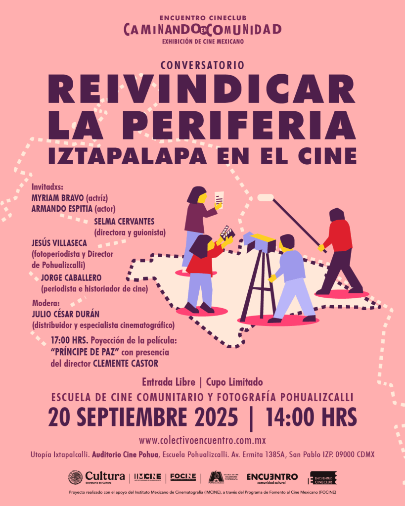 Encuentro Cineclub con el proyecto “Caminando en comunidad” y la Escuela de Cine Comunitario y Fotografía Pohualizcalli promueven el Conversatorio “Reivindicar la periferia, Iztapalapa en el cine”, como una apuesta para discutir cómo se vive y filma una de las regiones más vibrantes y estigmatizadas de la Ciudad de México. Además nos interesa reivindicar sus protagonistas, los rostros que llenan la gran pantalla en películas y narrativas diversas del Cine Mexicano Contemporáneo. Desde el cine comunitario y los lazos que de él se desprenden, hasta las películas que han marcado la memoria colectiva, preguntamos: ¿Cómo la periferia se reivindica y reinventa narrándose a sí misma?